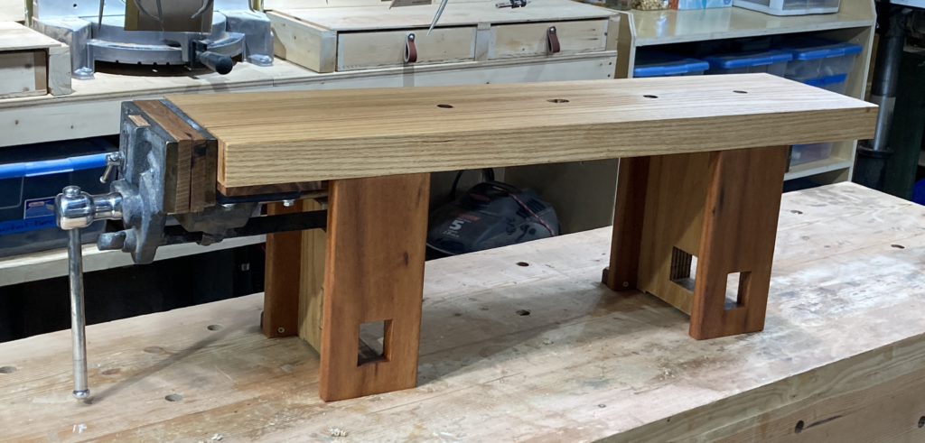 A picture of the new benchtop bench. The new one is about 2-3″ wider and 16″ longer than the old one. I kind of whacked that first one out of scraps and it worked so well, that like many such projects it took years to get around to making a better one.